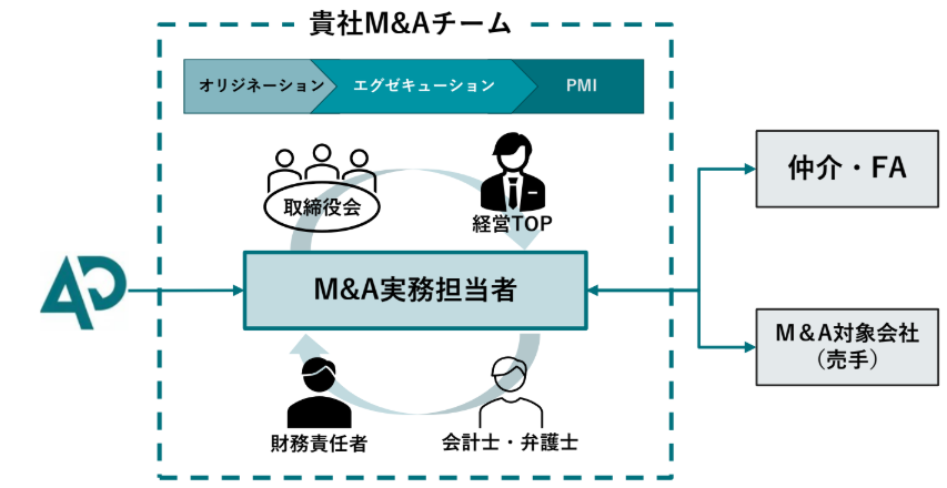 実際に売買の経験を積んだM&A実務の経験と知識を活かし、貴社の社内チームとして戦略立案やソーシング等のオリジネーション業務、交渉やDD等のエグゼキューション業務、PMIや社内M&Aチームの内製化支援まで、すべてのフェーズをハンズオンでサポートいたします。